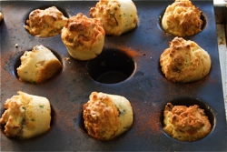 Spoon the mixture in to the prepared moulds, fill them to the top as they do not rise much, just a bit of a puff. Place the tray on the middle shelf of the preheated oven and bake for 25minutes. Once the muffins are cooked, remove the tray from the oven and dust it lightly with smoked paprika. Turn the muffins out on to a cooking rack and let them cool slightly before serving.